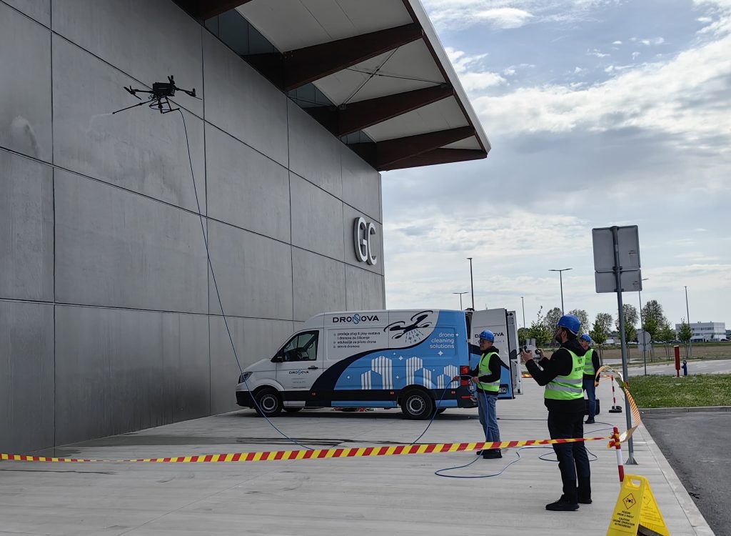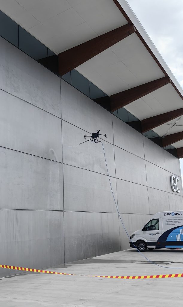 Die professionellen DroNova-Drohnen und die Plug-&-Play-Hochdruckeinheit CoreStation bilden ein einzigartiges System für die Höhenreinigung. Willkommen bei der nächsten Generation der Reinigung.